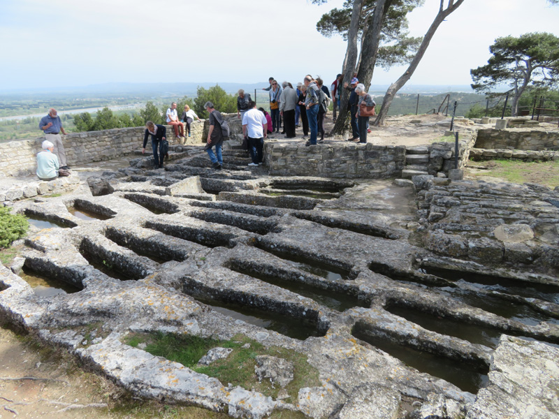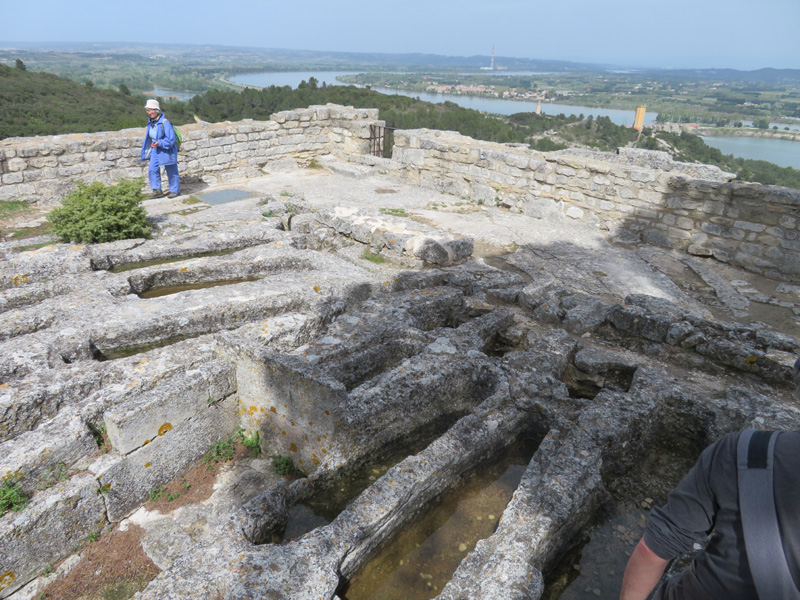 Marie-Paule m’a suggéré dans la voiture que nous aurions dû faire notre pique-nique à l’abbaye de Saint-Roman, pas sûr que nous ayons pu grimper avec les glaciaires pleines… Au bout de cette balade digestive nous avons retrouvé Mr Roche qui a fouillé et étudié les environs beaucairois pendant des décennies (parfois avec Claude). Mr Roche n’est ni plus ni moins qu’un audio livre qui se déplace, avec beaucoup d’humour, il nous a conté l’histoire de cette roche. A chacune de ces haltes, je mesurais à quel point il nous rendait la visite passionnante et nous évitait de grossières erreurs. Non, ce n’étaient pas des refuges pour hirondelles ces porte-lampes et tous ces abreuvoirs étaient des tombes truffées de détails énigmatiques... Du sommet de l’abbaye, Mr Roche nous a donné un cours de géopolitique au cours duquel, nous avons senti combien un fleuve pouvait écrire à lui seul l’histoire d’une contrée.